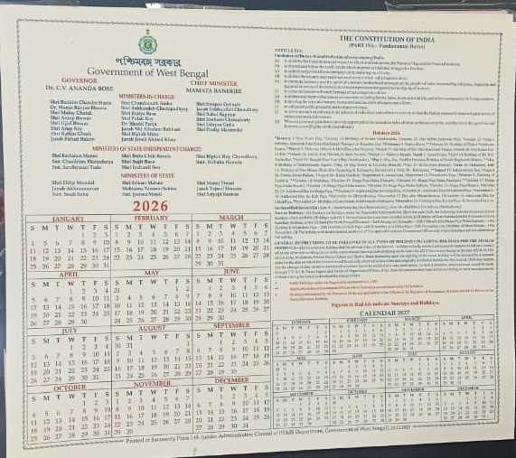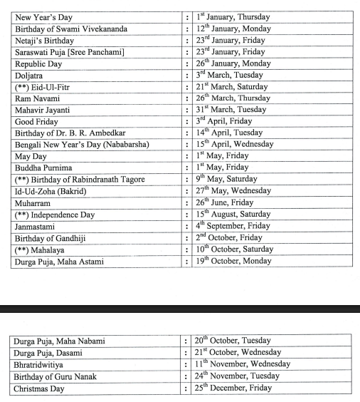 2. The Governor is also pleased to notify that the offices under the Government of West Bengal with the exception of the offices of the Registrar of Assurances, Kolkata and Collector of the Stamp Revenue, Kolkata shall be closed on the days as specified at List-II below which are not declared to be public holidays, during the year 2026.