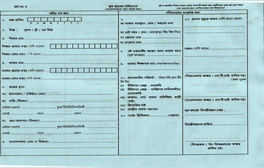 - Form No. 3 – Still Birth Report [ English Form | Bengali Form ]